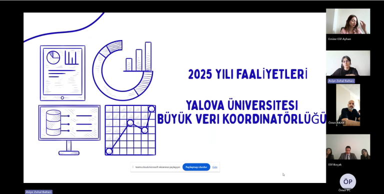 Üniversitemiz Büyük Veri Yönetim Ofisi Koordinatörlüğü tarafından, Yalova Üniversitesi Büyük Veri Koordinatörlüğü paydaşlığında düzenlenen “Büyük Veri ve Yönetimi” konulu bilgilendirme toplantısı 15 Nisan 2026 tarihinde çevrim içi olarak gerçekleştirildi.